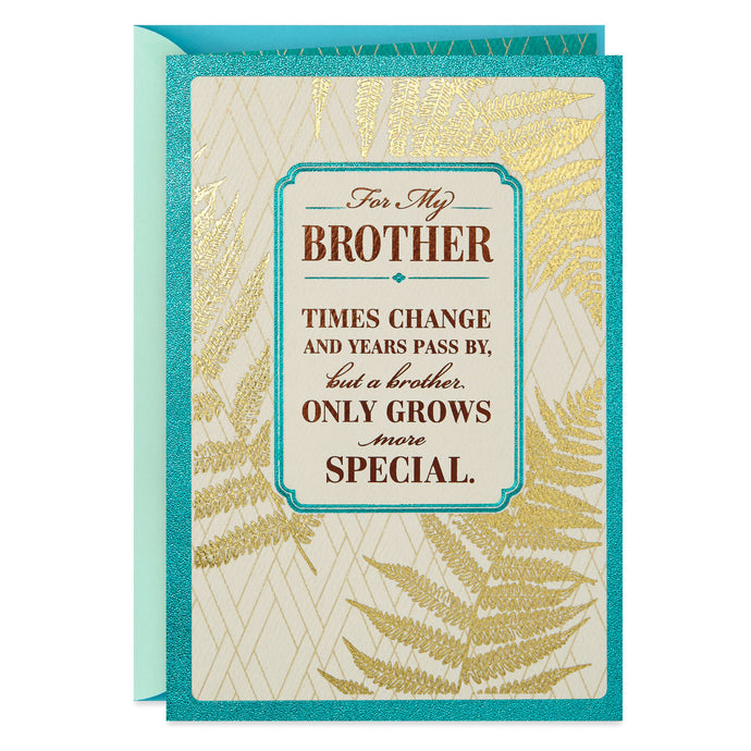 Make his birthday shine with this beautiful gold foil fern leaf card that delivers the happiest of birthday wishes for a brother. The card's cover features an embossed plaque in the center with gold foil print and bright metallic ink.- Birthday greeting card features embossing, foil and metallic ink.