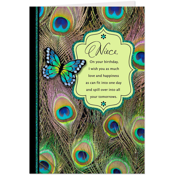 - Birthday greeting card for your niece sends heartfelt wishes for love and happiness and features a peacock feather design with a die-cut butterfly attachment, glitter and sequins.
