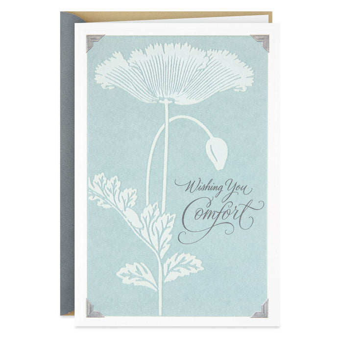Share a compassionate message of comfort and empathy with this simply stated sympathy card. The thoughtful words and silhouetted poppy design on this card are enhanced by fuzzy ivory accents and a light blue metallic sheen.- Sympathy greeting card features fuzzy accents and a metallic ink finish.