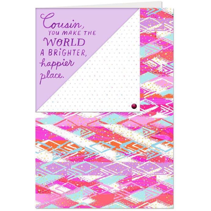 - Birthday greeting card for your cousin features a geometric background with a folded corner. Accented with glitter, embossing and foil, this greeting is sure to elicit a smile.