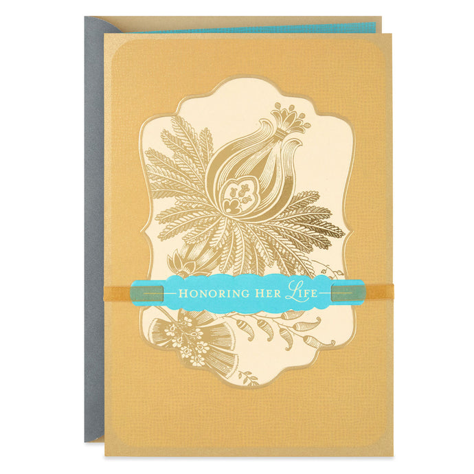 This thoughtful sympathy card reminds a woman's grieving loved ones that her influence lives on in the hearts and minds of those lucky enough to have known her. This golden greeting honors the loss of a very special woman.- Sympathy greeting card for the loss of female relative features foil, metallic ink, embossing and organza ribbon.