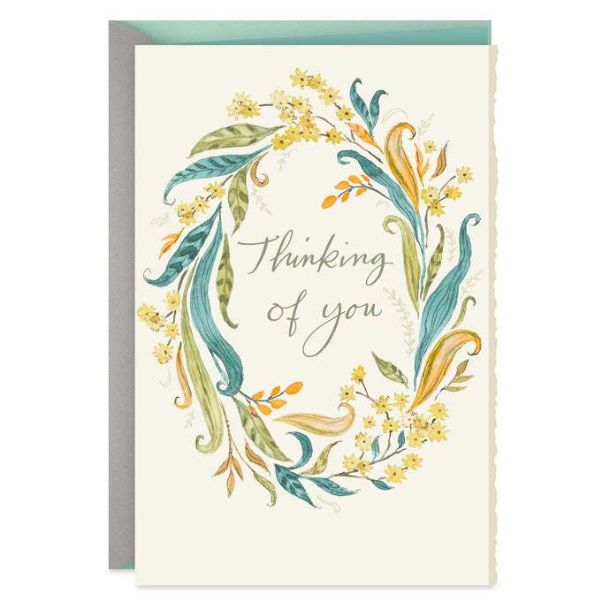 Send warm wishes of support with this get-well card that features a floral wreath illustration in soft colors. Touches of gold metallic ink, a deckled edge and natural-colored textured paper complete the comforting presentation.- Get well greeting card features metallic ink accents and a deckled edge.