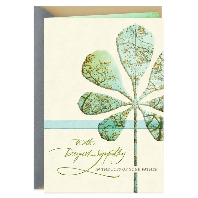 Share your sorrow for a friend whose father has died with simple elegance in this restful card. Design features a single embossed flower with each petal having scalloped edges, an inset photo of flowering branches and a dashed embossed line adding texture, all in comforting shades of pale blue and pale green on a textured cream background.- Sympathy card features embossed design.
