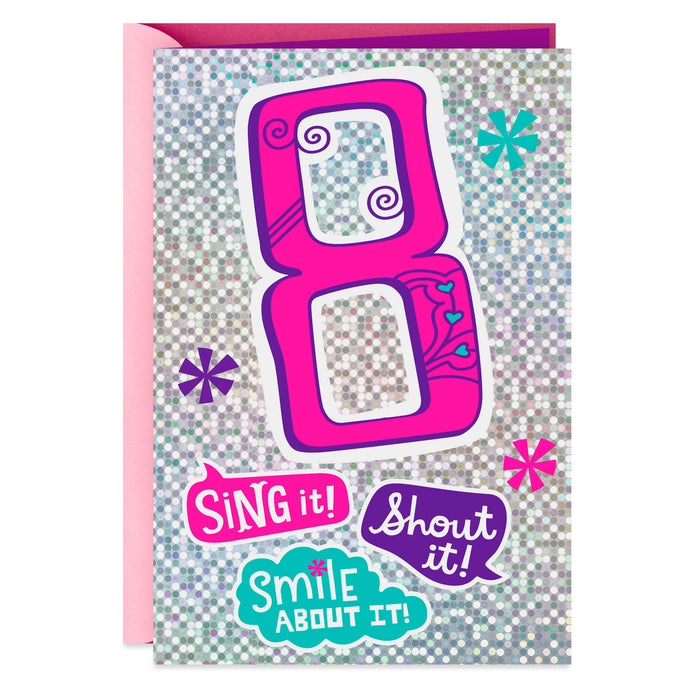 Asterisks and geometric styling create a cool scene on the cover of this birthday card, which celebrates a milestone birthday for a special girl: 8! Shiny foil accents dress up the raised design for a fun finish.- Birthday greeting card features raised design and foil.
