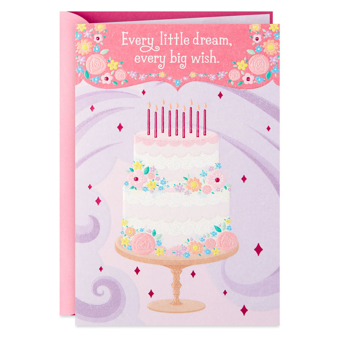 Colorful flowers decorate a layered cake on the cover of this beautiful card, which is a sweet way to celebrate the special birthday girl. Shiny foil and glitter accents dress up the raised design for a fun finish.- Birthday greeting card features raised design, foil and glitter.