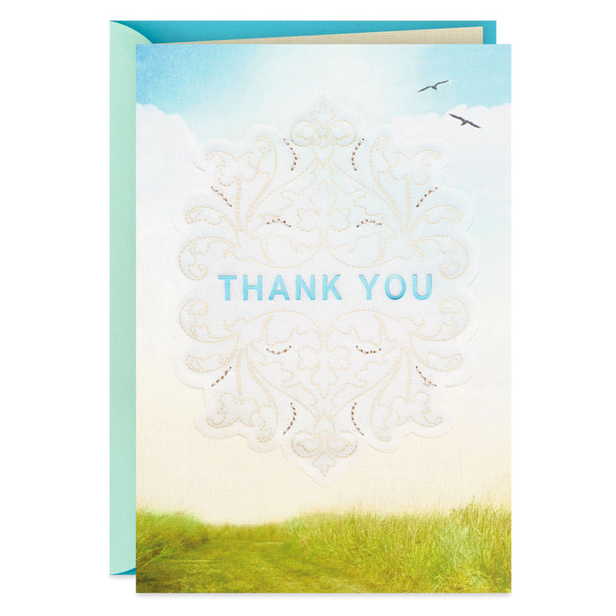Send a warm message of thanks inside this pretty, embellished card. Featuring a landscape background decorated with embroidered and foil-accented vellum, this card will convey your heartfelt message in an elegant display.- Thank-you greeting card features a die-cut vellum attachment with foil and embroidered accents and a linen-look finish.